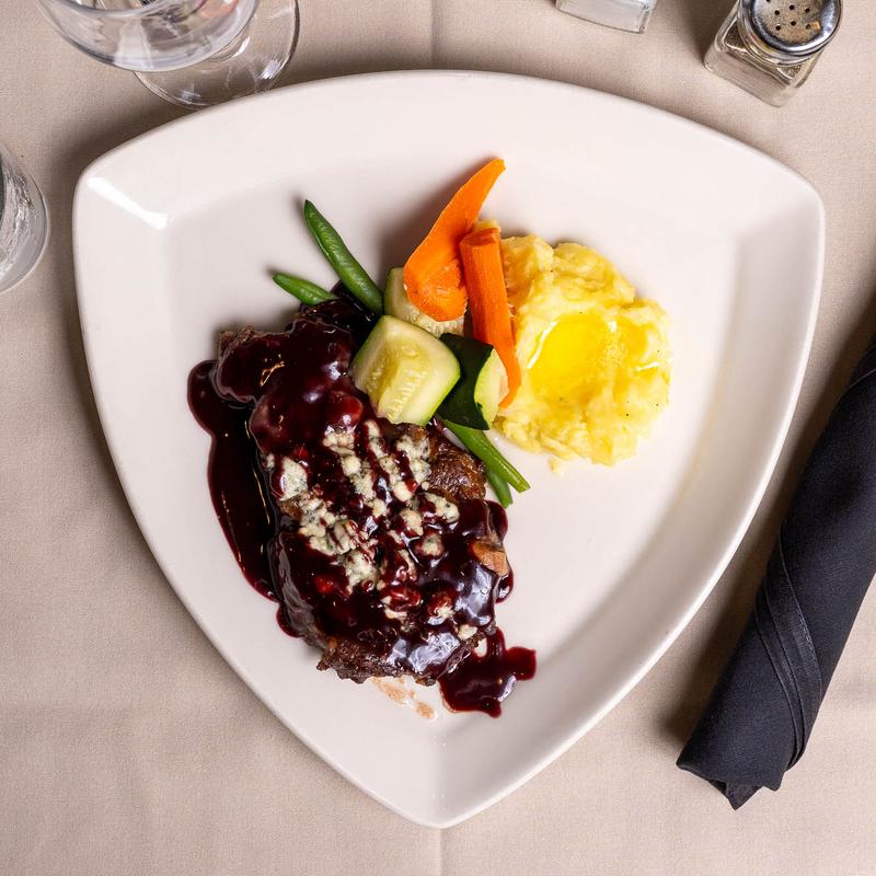Braised in red wine reduction sauce with berries, leeks and gorgonzola cheese; served with herb mashed potatoes and vegetables